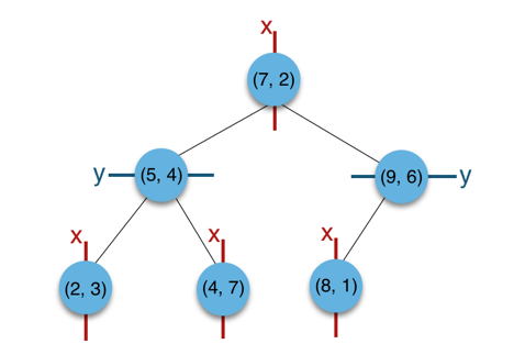 我们将上面的二维数据点的二叉树建立的过程中,维度的转换过程在一个平面上可视化出来,就可以得到上面的一个对整个平面进行二分划分的可视化结果图。例如红色的竖线就表示在建立二叉树过程中,对X维度的二分分割。蓝色的水平线就是表示对Y维度的二分分割。
