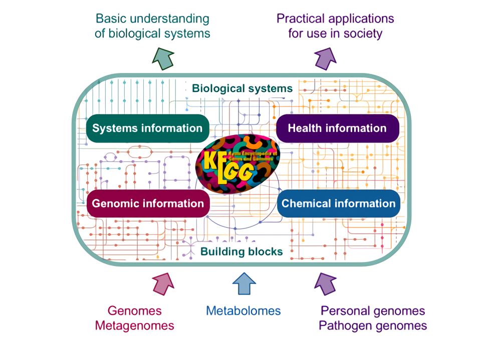 KEGG is a database resource for understanding high-level functions and utilities of the biological system, such as the cell, the organism and the ecosystem, from genomic and molecular-level information. It is a computer representation of the biological system, consisting of molecular building blocks of genes and proteins (genomic information) and chemical substances (chemical information) that are integrated with the knowledge on molecular wiring diagrams of interaction, reaction and relation networks (systems information). It also contains disease and drug information (health information) as perturbations to the biological system.