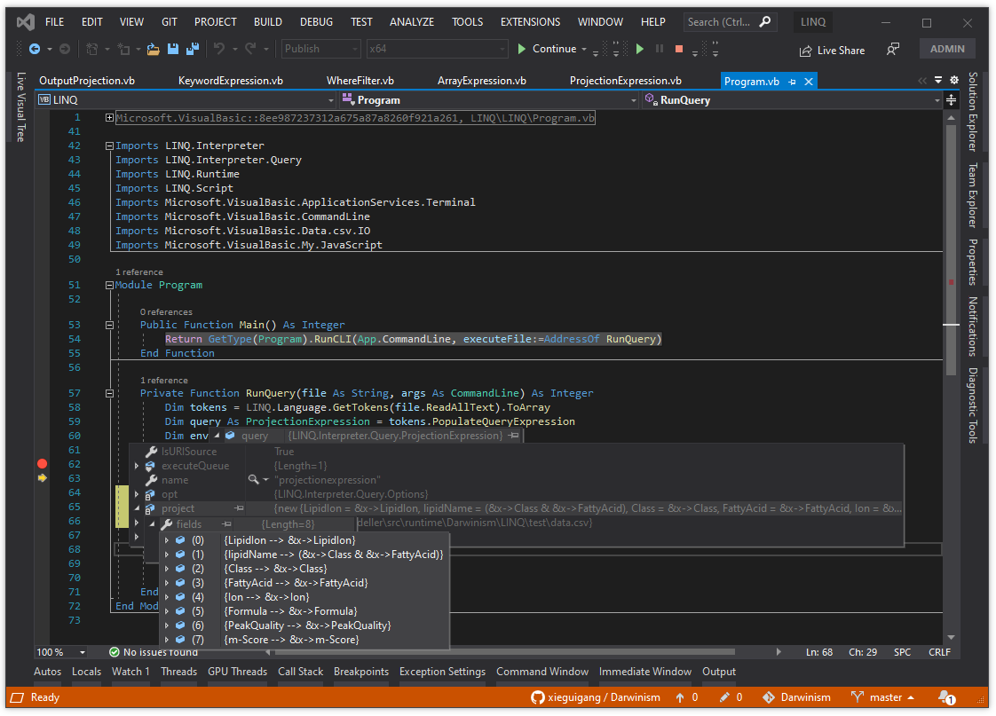 所以我在这里开发了一个LINQ脚本化查询的计算引擎,用来方便自己平时的Excel数据操作。项目的源代码放在了这个位置: https://github.com/xieguigang/Darwinism/tree/master/LINQ/LINQ