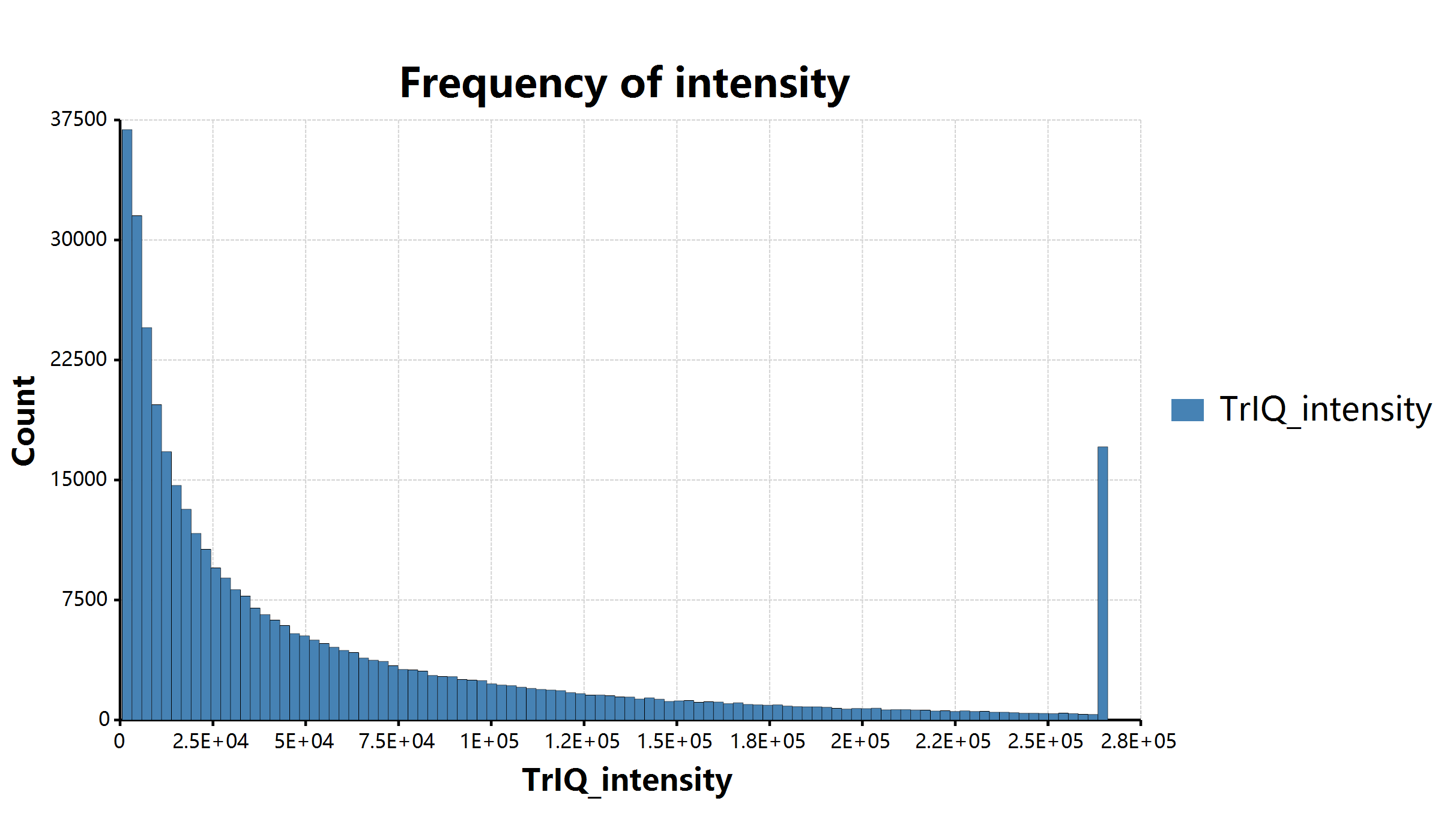 首先我们来查看质谱成像的原始信号值的分布一般是怎样的。我们先通过mzkit程序包所提供的质谱成像相关的函数进行响应度值的获取,接着呢,就可以通过直方图来简单的查看信号值的分布情况: