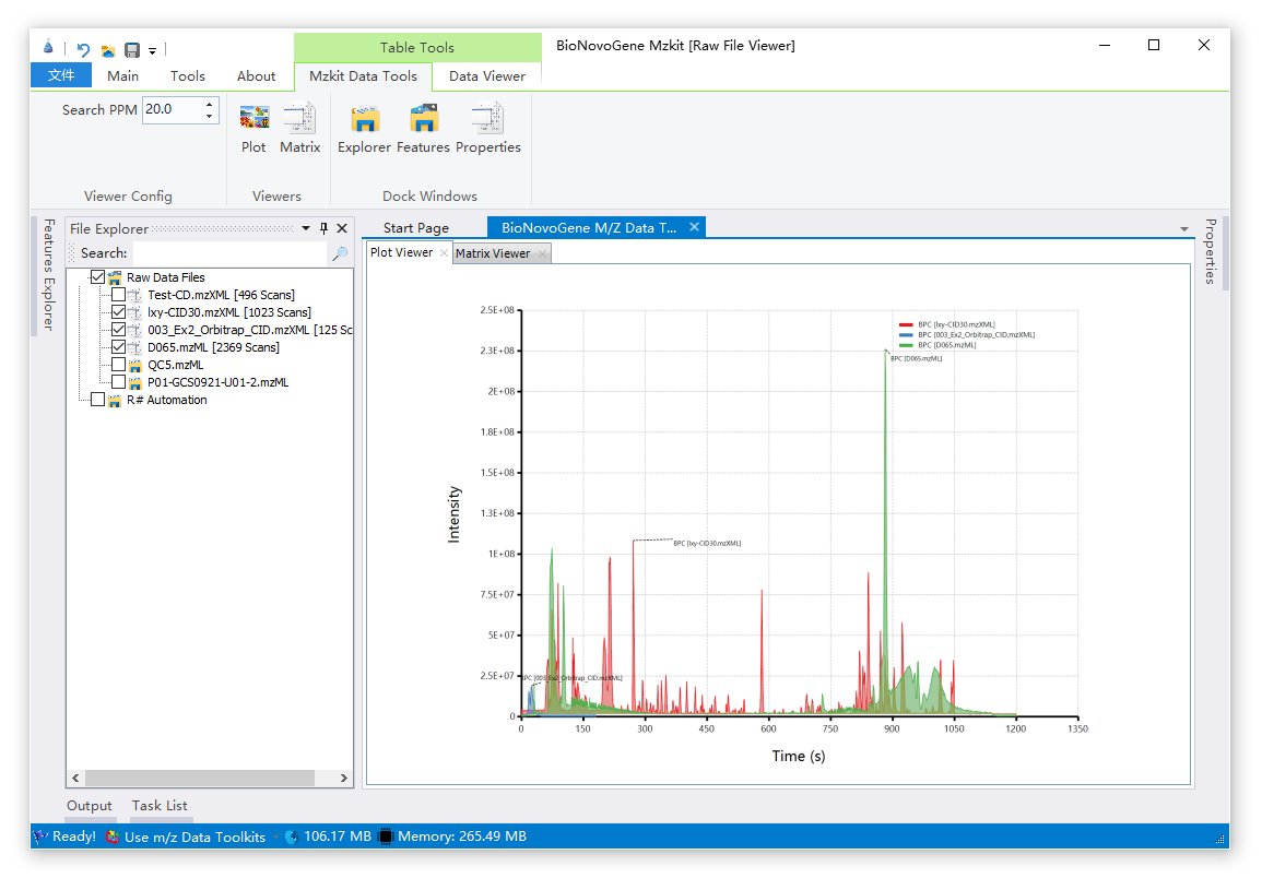 上面所介绍的操作是针对于单个原始数据文件的色谱图查看的。那么如果我们需要查看两个原始数据文件的色谱图叠加的情况呢?这个就会需要用到我们的原始文件浏览器来操作了: