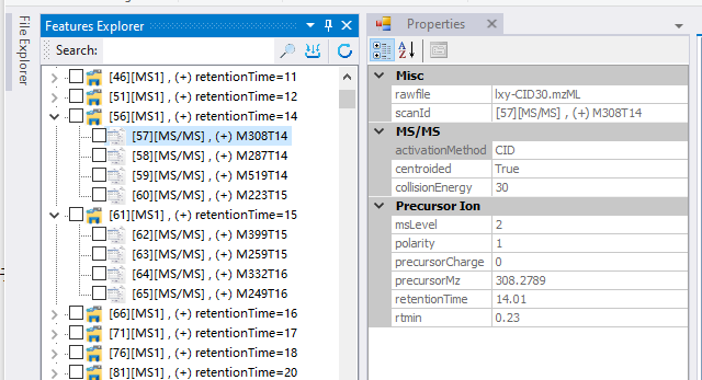 在mzkit软件之中,在显示质谱图的时候,还会显示质谱图相关的属性信息。例如碎片产生的碰撞方式,电压,极性,保留时间范围等信息。