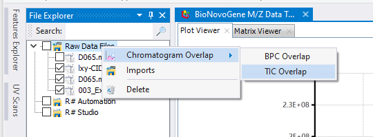 - 最后,通过右键的上下文菜单,选择TIC或者BPC类型的色谱图叠加就可以查看对应的叠加图了。