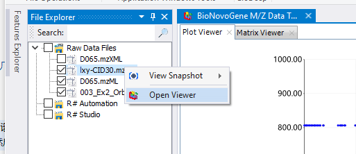 我们在mzkit软件之中,除了可以通过鼠标点击相应的数据,查看对应的谱图以外。还可以通过色谱图浏览器,更加深入的查看我们的原始文件中的数据内容。我们通过在原始文件浏览器之中,通过选择某一个原始数据文件,然后再通过鼠标右键,弹出来的菜单中选择【Open Viewer】就可以打开mzkit软件的色谱图浏览器了:
