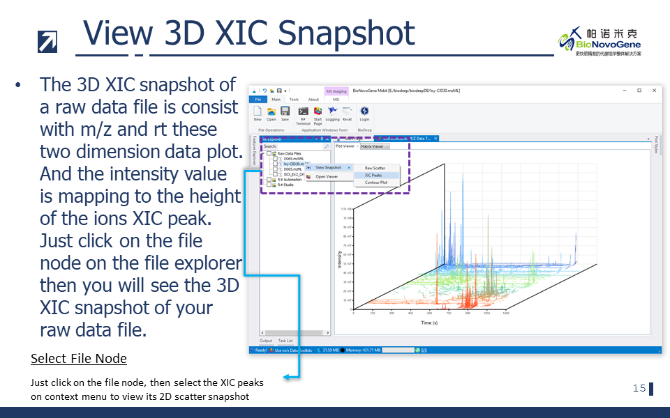 在mzkit软件之中查看色谱图非常的容易,我们只需要在原始数据文件上调用相应的上下文菜单的命令就好了。例如,如果我们需要绘制TIC或者BPC图,我们可以在【Feature Explorer】窗口中点击鼠标右键;然后点击TIC或者BPC就可以查看到相对应的色谱图了。
