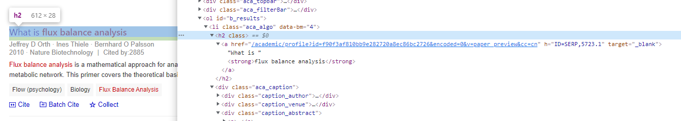 可以看得到,title字段的值,是位于一个h2标签内。所以我们对h2标签取文本值可以得到标题文本。文章在必应搜索数据库中的唯一编号在a标签的链接属性中,我们取出链接href属性,然后基于正则文本解析,得到id的值即可: