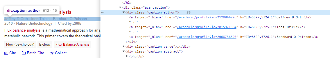 至于文章的作者列表,是位于caption_author类的div标签中的a标签列表中。我们可以通过数组来存储这个列表数据。对于每一个作者而言,其包含有作者名字,以及作者在必应数据库中的唯一编号这两个属性,也可以按照文章title类似的方法解析出来:
