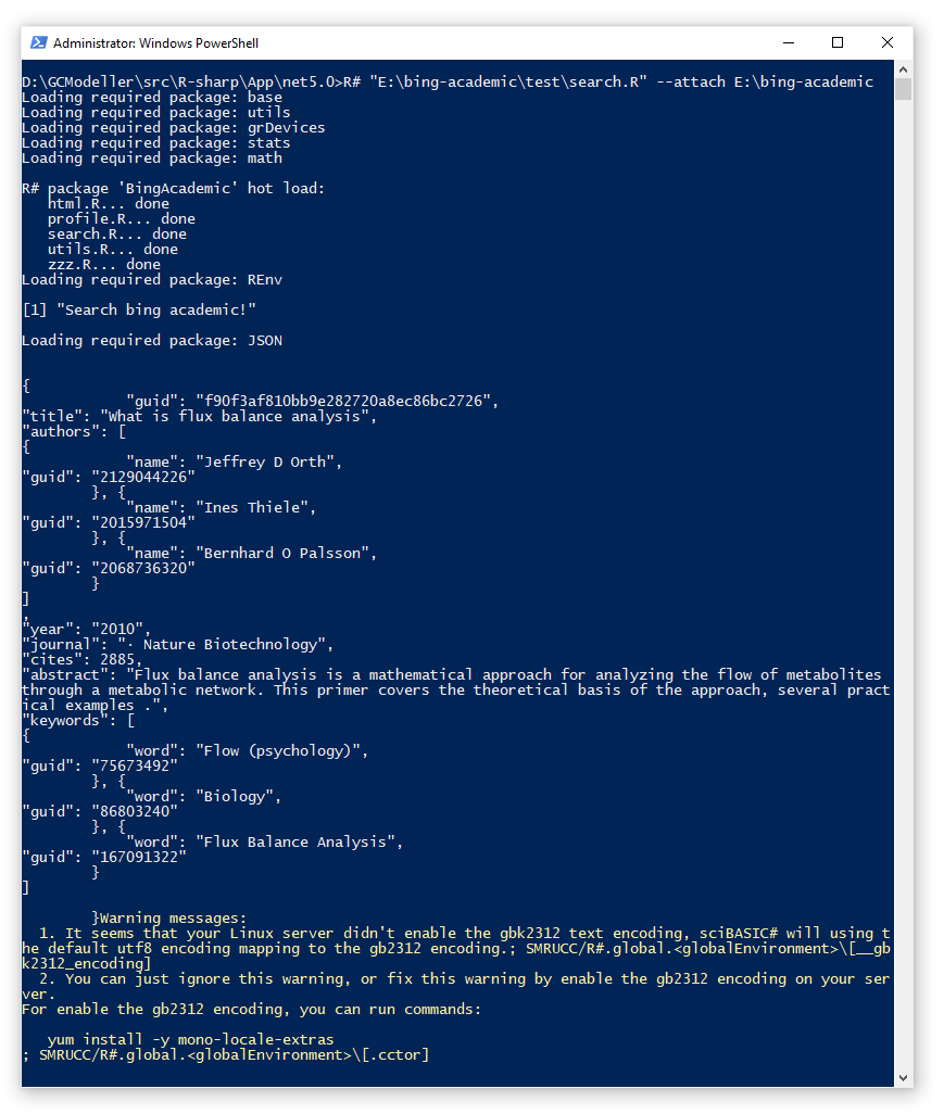 将上面所提到的函数和查询脚本串接起来,执行一下,就可以得到一个必应学术的查询过程。在R#环境中执行下面的查询函数,就可以得到查询结果: