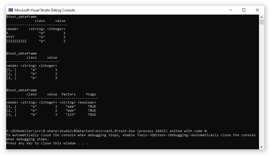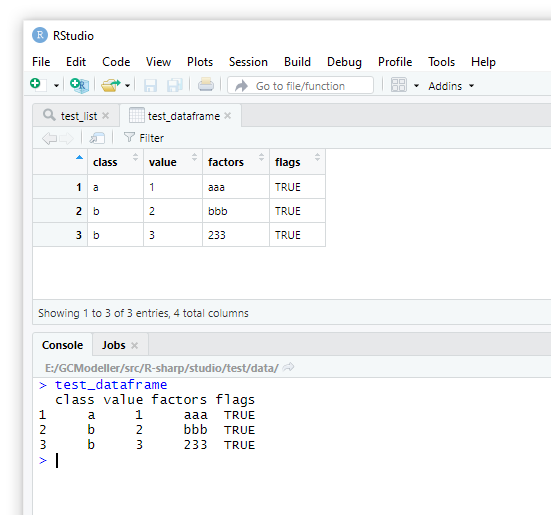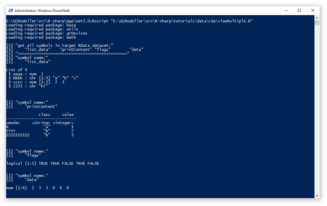 执行一下,可以看得到,在R#环境之中的RData数据集加载结果与R环境中的原始数据之间保持一致。
