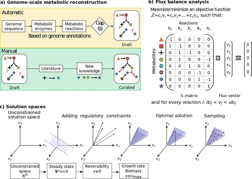 • b. In flux balance analysis (FBA), the metabolic reconstruction containing n reactions and m metabolites is converted to a stoichiometric matrix S. FBA solves an optimization problem where an objective function Z is maximised or minimised. Z is formed by multiplying every reaction flux vi with a predetermined constant, ci, and adding the resulting values. FBA solves a steady state, Sv = 0. Every reaction i is bound by two values, an upper bound (ubi) and lower bound (lbi).