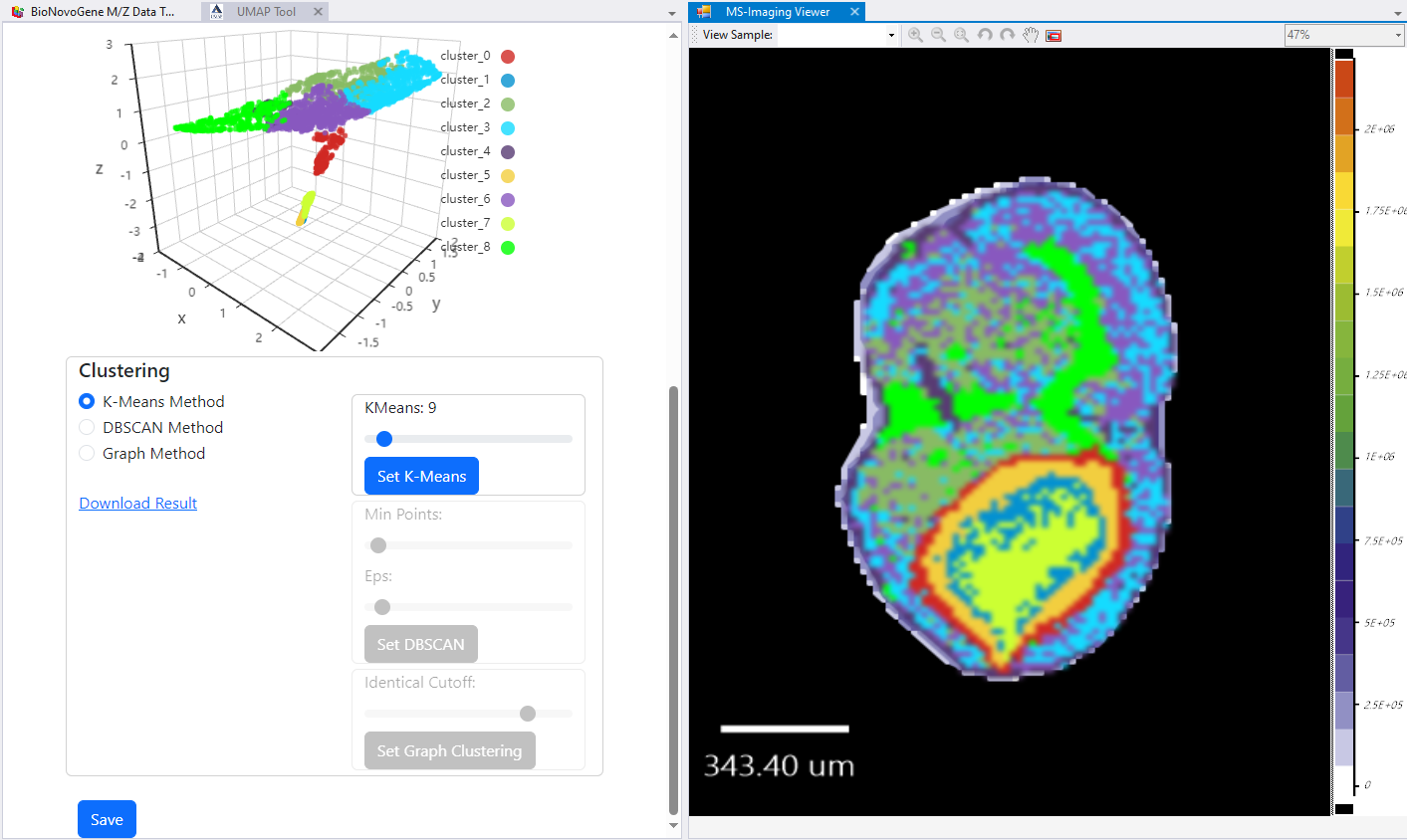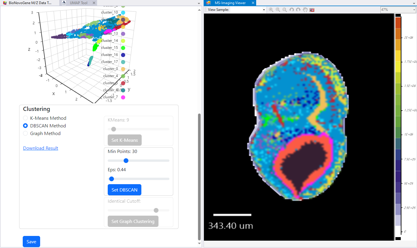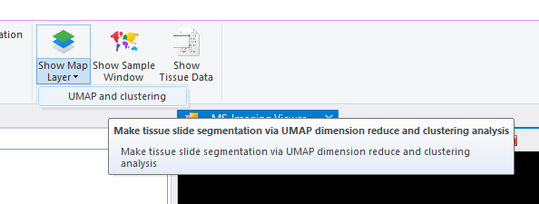 在这里我们假设已经可以正常的将空间代谢数据导入至MZKit工作站软件之中。假若需要借助于MZKit工作站软件进行切片组织样本的自动化分区操作,相关的功能可以在【MSI Analysis】菜单栏中寻找到。在这里我们打开【Show Map Layer】按钮,选择【UMAP and clustering】功能。