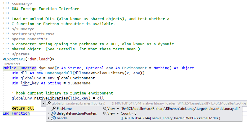 在R语言之中存在有一个名称为dyn.load的函数用于加载基于C、C++、Fortran,Java,Rust等语言编写的动态链接库。所以在R#语言之中也将会通过模仿R语言的dyn.load函数进行rust动态链接库的加载操作。在外部的动态链接库的加载方面的相关知识,我是一窍不通的,但是非常幸运的是,在之前所使用的R.NET项目之中,存在有一个类似的需求,就是在.NET程序运行时加载R环境的动态链接库。R.NET的作者在Github上开源进行这一动态加载的工具代码(https://github.com/rdotnet/dynamic-interop-dll),这样子借助于这个项目,我们就可以实现类似于dyn.load的动态加载工作了: