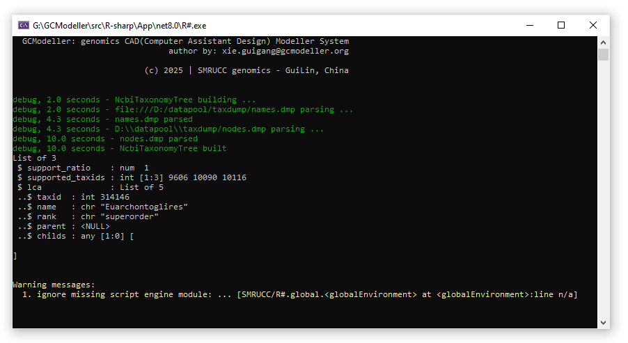 将上面所描述的LCA算法导出为GCModeller程序中的一个工具函数后,我们就可以在R#脚本语言中进行相关的LCA祖先节点的计算,下面为一个demo脚本: