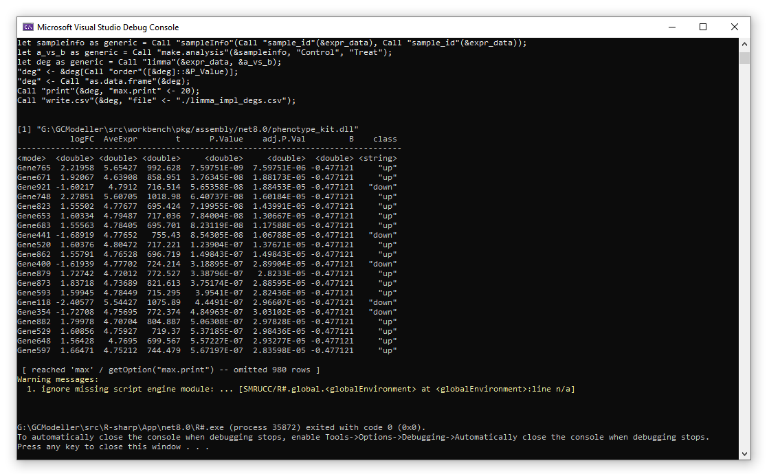 最后,我们在这里可以通过集成在GCModeller程序包中的基因表达工具中的limma函数进行差异检验分析。以下的R#脚本为对所复现的limma函数方法的demo测试脚本: