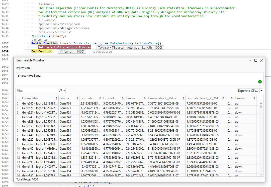 通过 Yield 关键字,我们在这里所实现的limma差异检验函数会为每个基因生成一个 LimmaTable 对象,最终形成一个完整的差异表达分析结果列表,方便后续进行筛选、可视化和生物学解释。