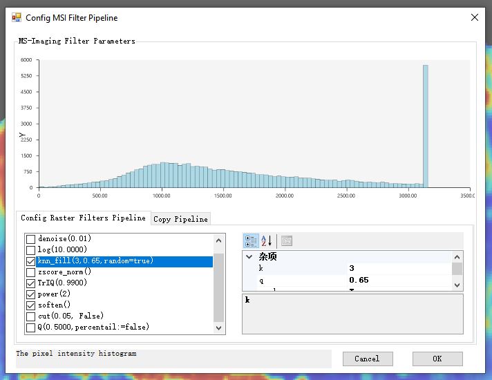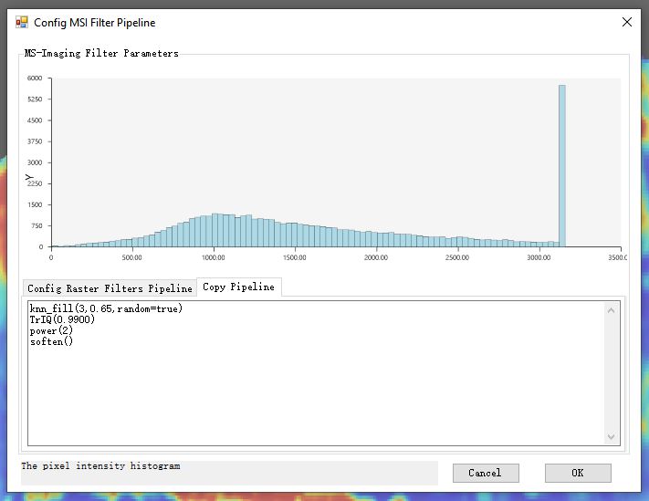 首先,我们在打开了软件界面之后,完成原始数据的加载。然后再主界面上,通过【Tweaks MSI Filters】菜单打开滤镜配置窗口。在这里我们可以调整目前整个流程支持的一些图像信号数据处理的滤镜参数。完成调整后,可以切换至【Copy Pipeline】标签页进行滤镜参数的复制,然后将复制的滤镜参数信息粘贴到我们所编写的ggplot成像可视化脚本中,作为的参数即可。geom_MSIfilters