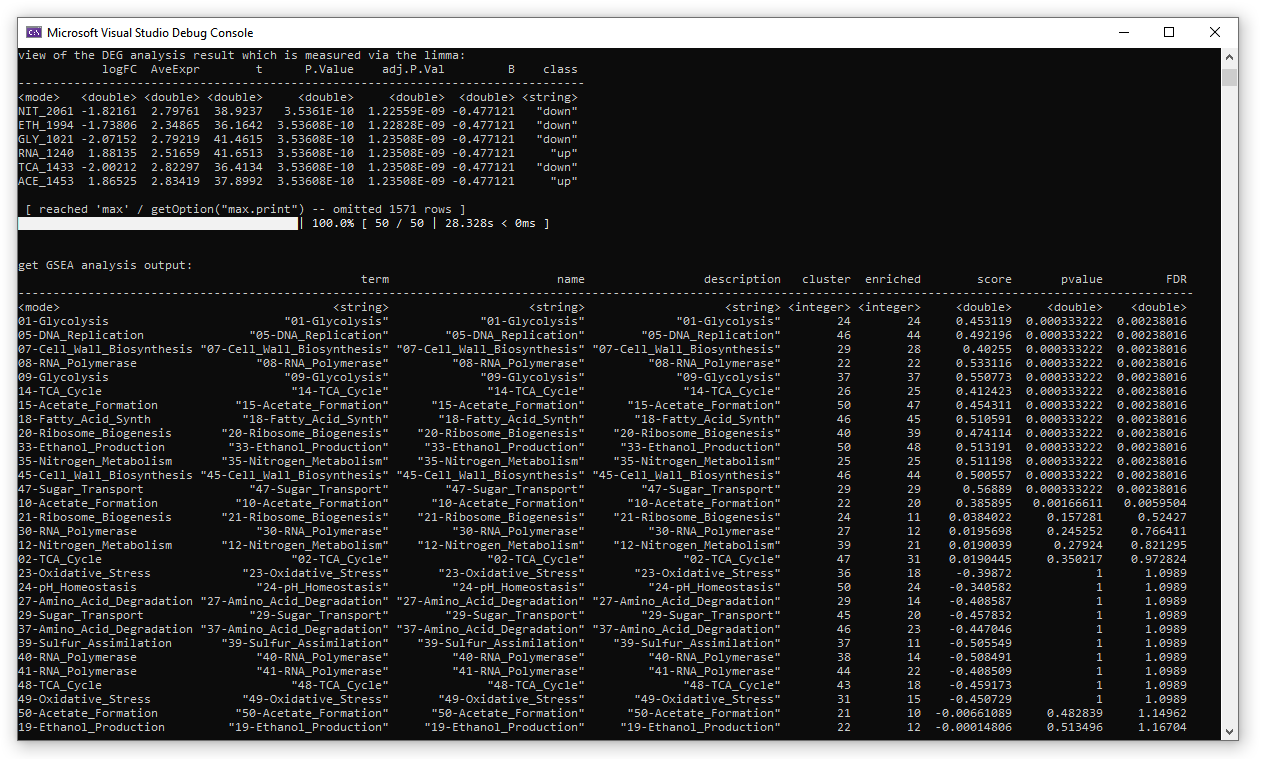 在下面的一段R#脚本代码展示了我们如何针对某一个基因表达矩阵做limma差异检验,然后针对差异检验结果做通路富集计算分析的流程: