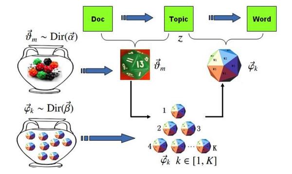 - 生成文档中的每个词:有了文档的主题骰子和各个主题的词骰子,文档中每个词的生成就变成了一个两步的掷骰子过程: