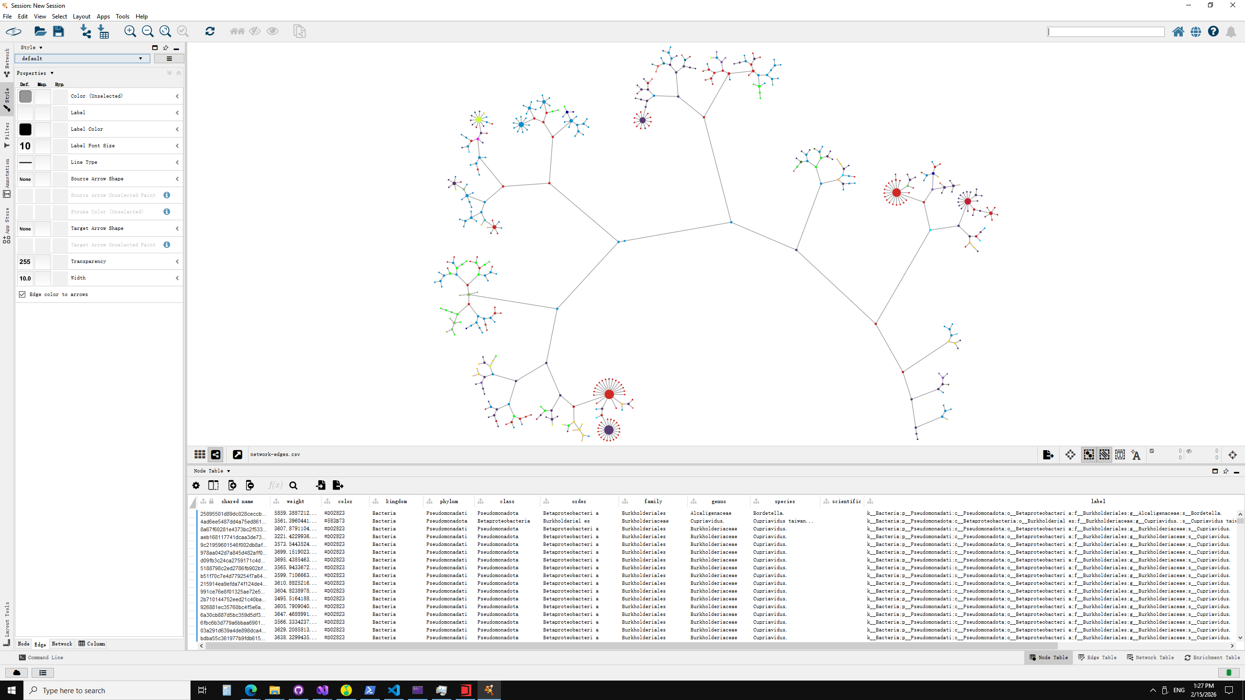 运行上面的测试脚本,程序导出了两个表格:network-edges.csv表格存储着我们所构建的二叉树的树枝的信息,也就是节点间的网络边连接信息。而nodes.csv表格存储着基因组的节点信息,包括基因组的唯一编号,物种树信息,以及按照phylum层级进行节点染色的颜色代码结果。现在,我们打开Cytoscape程序,然后通过【File】菜单导入network-edges表格,然后再导入nodes信息表格。之后我们按照相应参数设置好样式映射,最后通过顶部的菜单【Layout】中选择【yFiles Circular Layout】布局,我们就可以将我们的二叉树在cytoscape软件中可视化出来。